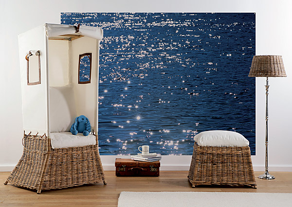 Кроме того, нужно комнату обставить светлой, а лучше всего белой мягкой мебелью с деревянным журнальным столиком. Фотообои, изображающие ярко-синие море отлично сочетаются с предметами интерьера бледно-песочной расцветки.