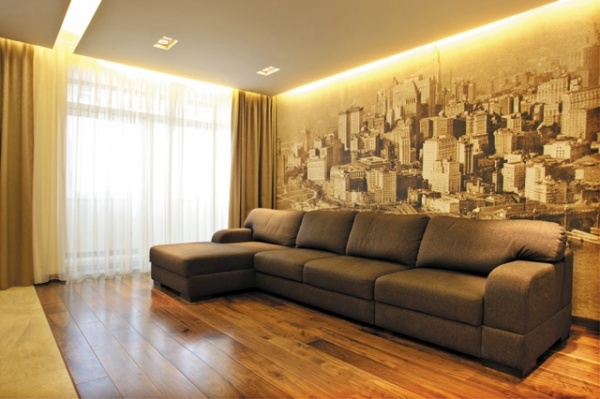 - если мебели в комнате было и будет много, использовать широкоформатные изображения не следует − им на замену тут приходят «панорамные обои», то есть длинные, невысокие полотна.
