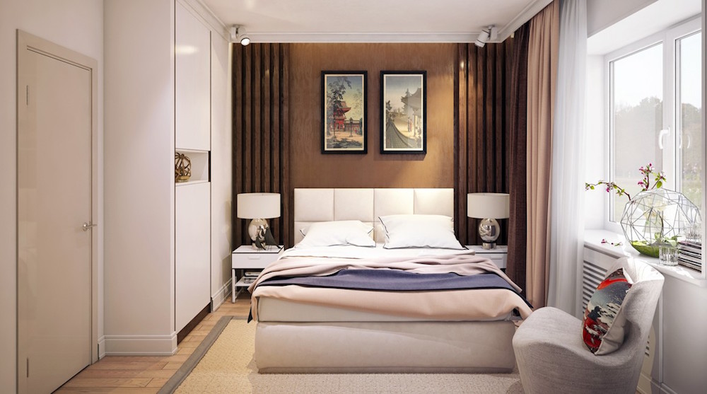 При оформлении спальни небольшого размера предпочтение следует отдать светлым тонам, а для разнообразия добавить яркие акценты