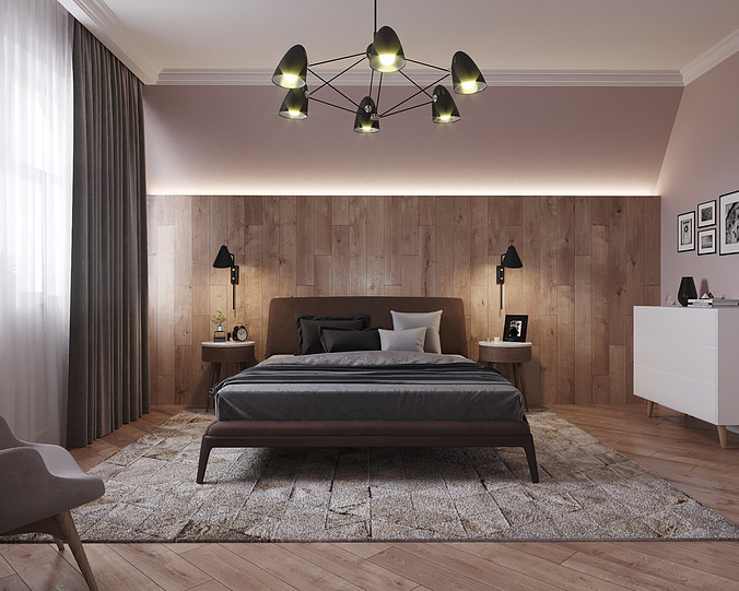 Стильная спальная комната в духе модерна с отделкой ламинатом акцентной стены