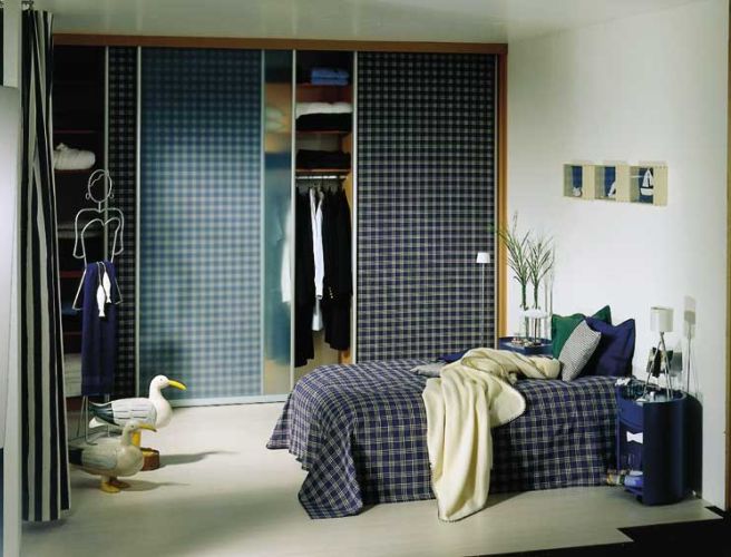 Встроенный шкаф, гардеробная в спальне – как ни крути, а очень громоздкое сооружение. Если компактная спальная, то не стоит использовать глухие деревянные дверцы, потому как это уместно лишь для просторных помещений.