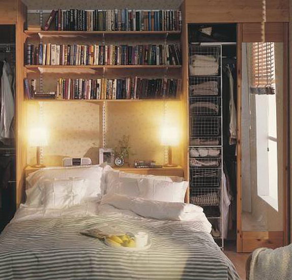 Интересное решение – установка гардеробной за кроватью, при этом такая гардеробная не займет много места, оптимально ее устроить в углу комнаты, а кровать поставить сразу же за ней. Сама гардеробная может быть в форме треугольника, трапеции и даже полукруга.