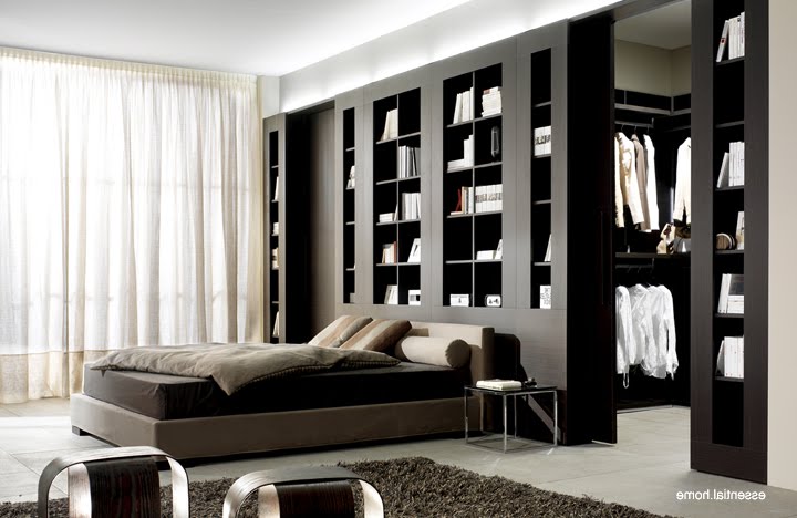Интересно и оригинально в интерьере спальни будет смотреться гардеробная, которая располагается за изголовьем кровати