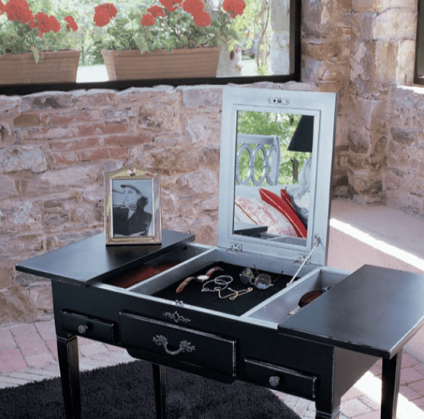 Чуть менее популярная модель – столик-секретер, где в среднем отсеке сформирован потайной ящик с откидной крышкой, на которую закрепляется зеркало.