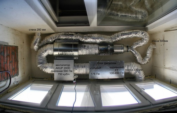 Приточная вентсистема с двухступенчатой очисткой воздуха. Пылевой фильтр (первая ступень) создан на базе фильтра для автомобильного салона, который рассчитан на очистку воздуха, окружающего автомобиль в уличной пробке.